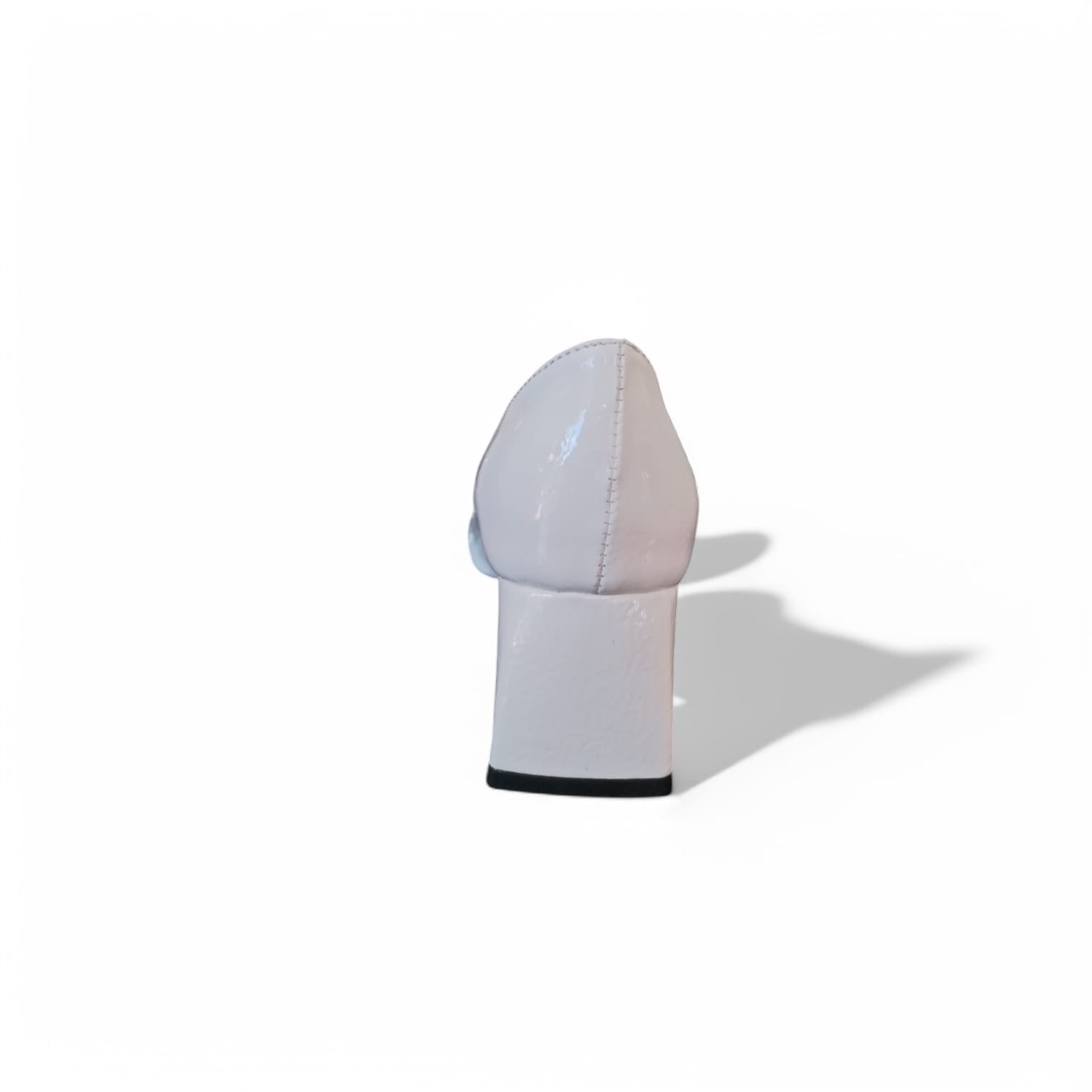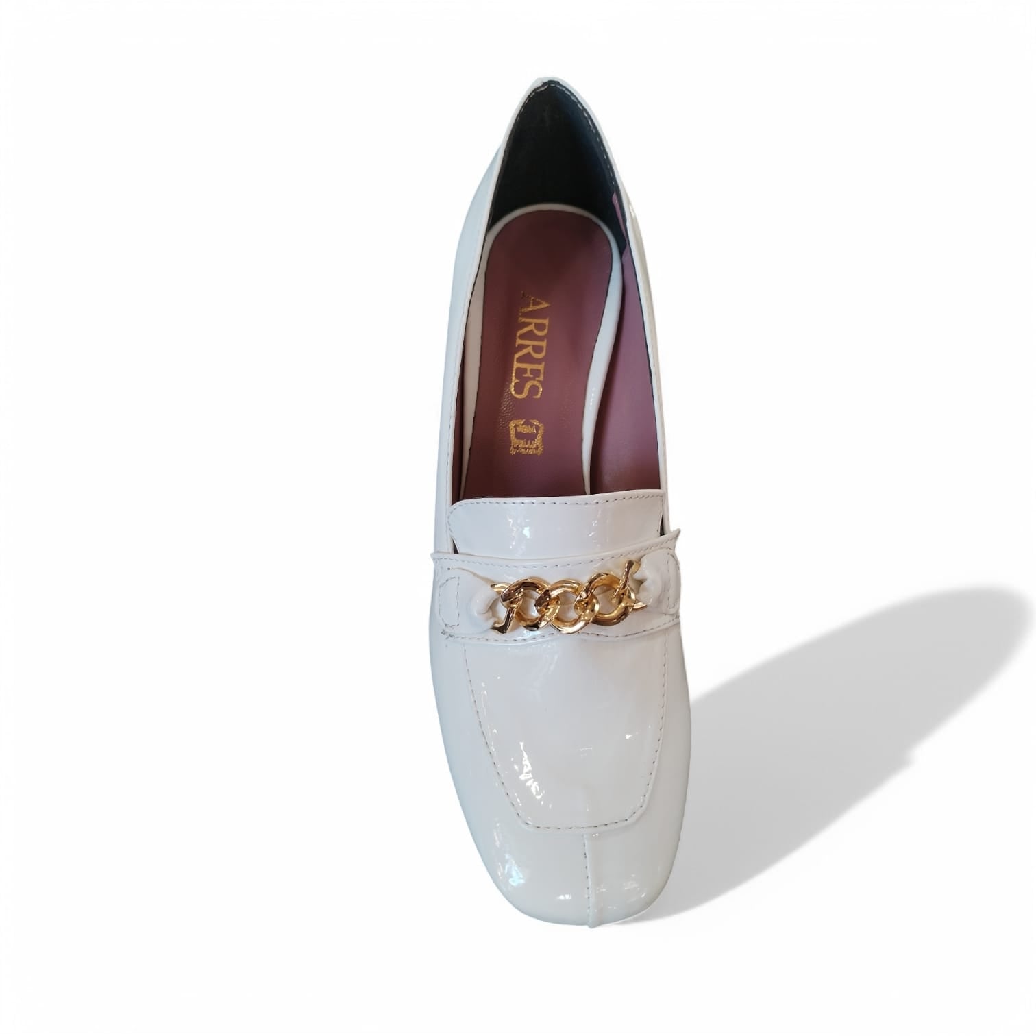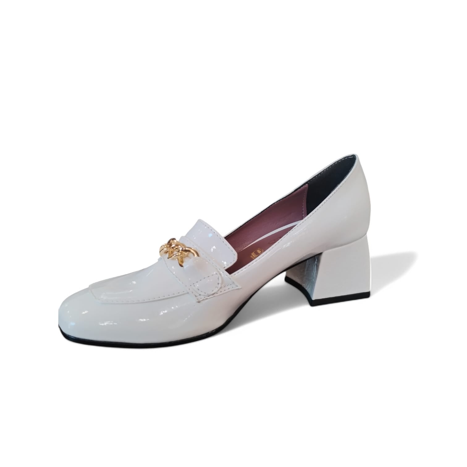 Bianca in ecopelle lucida con pattina superiore grezza e una catenella color oro.