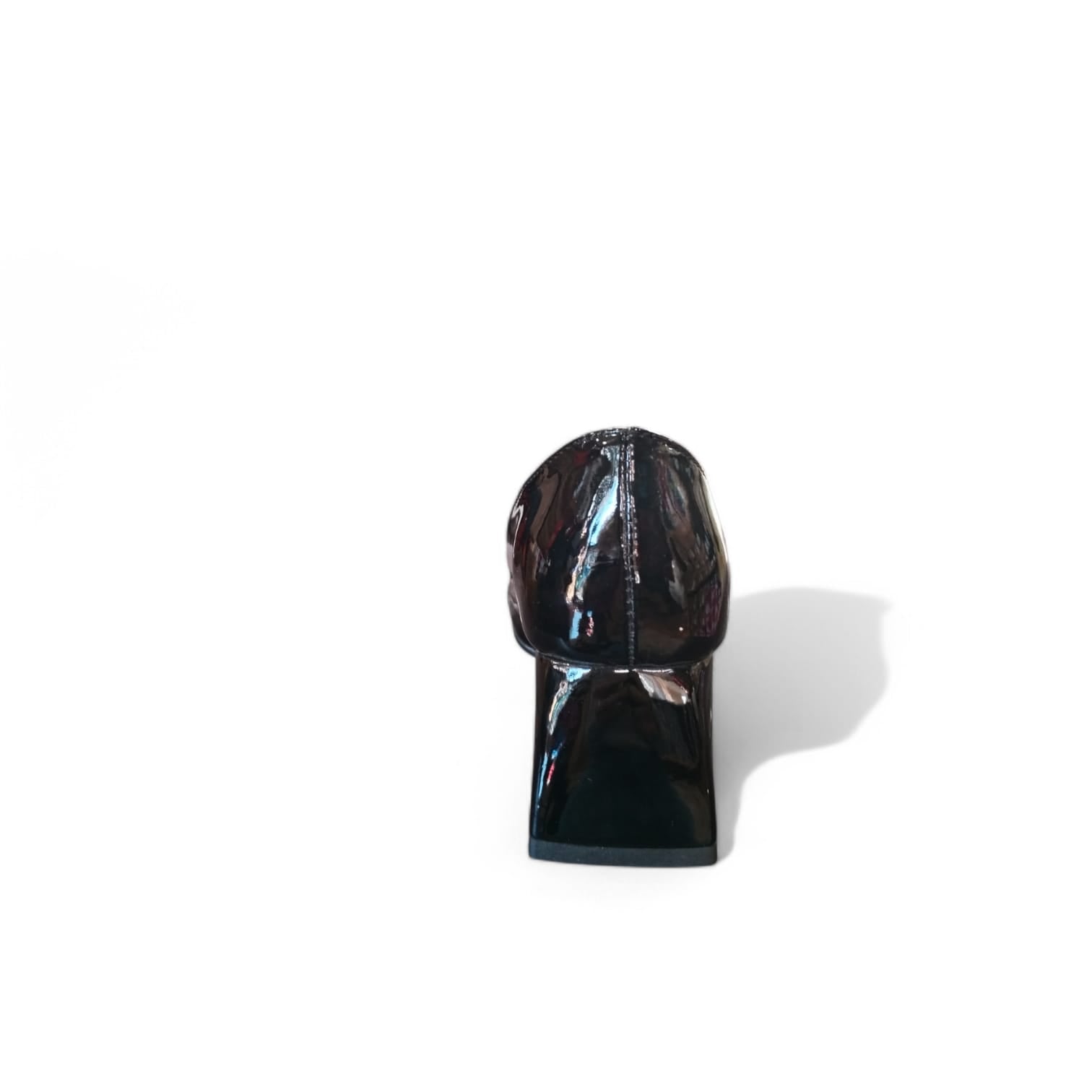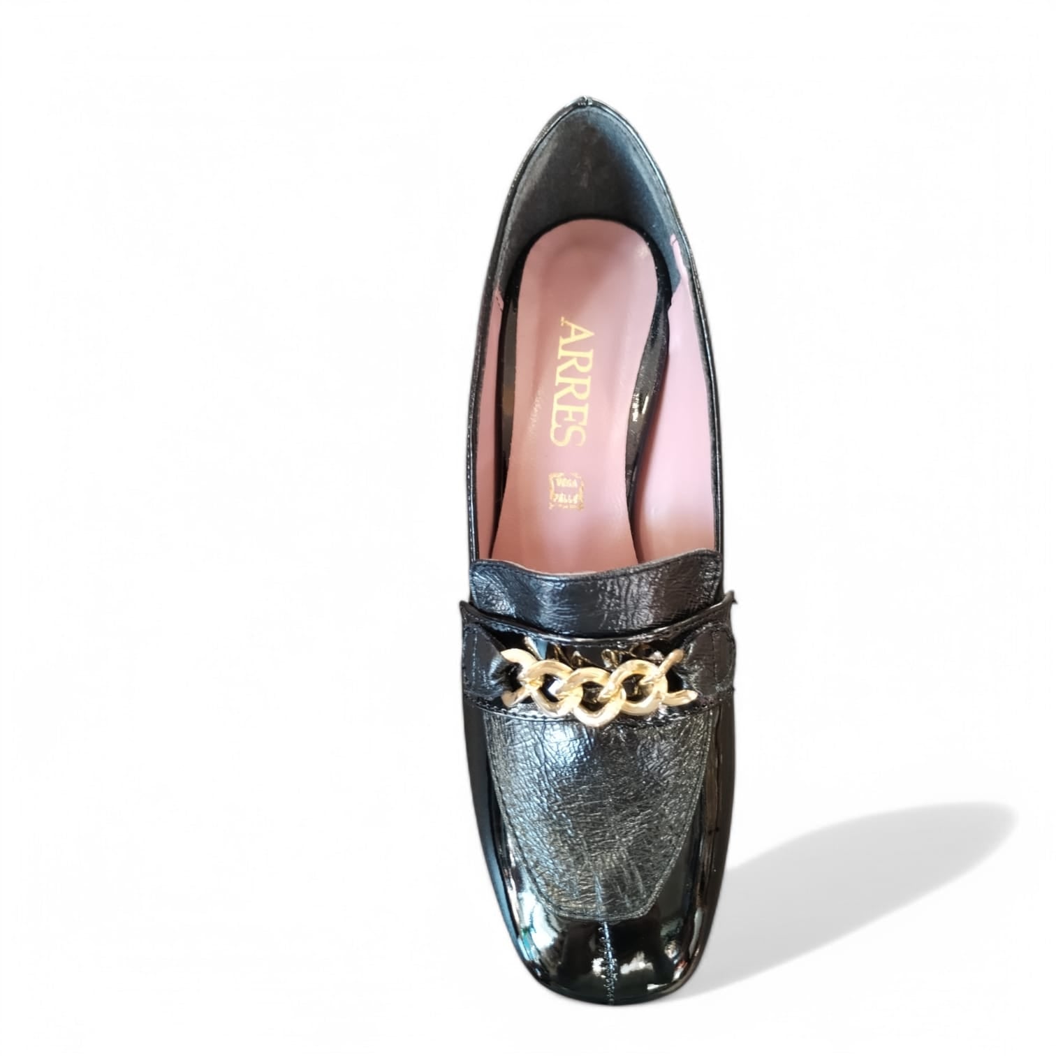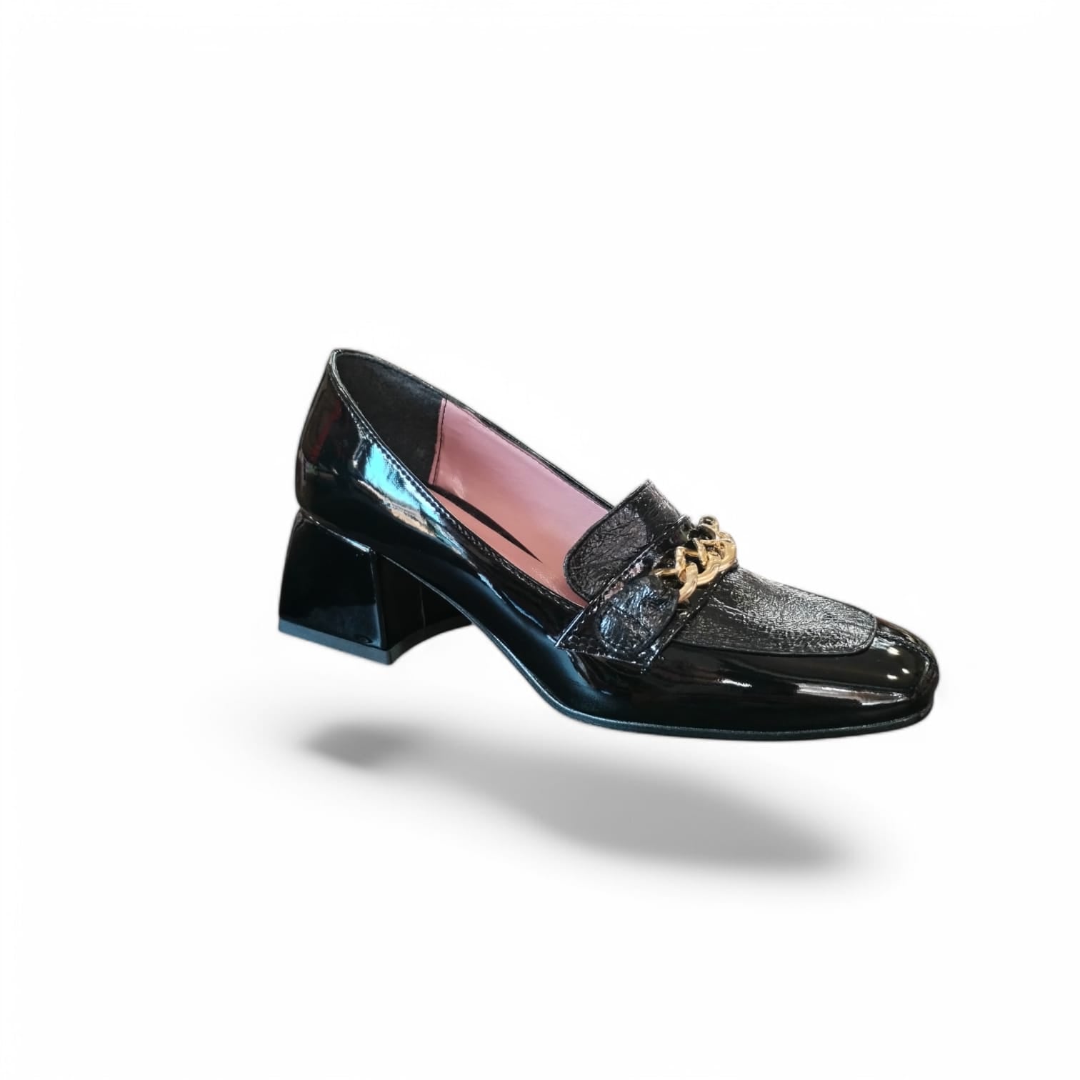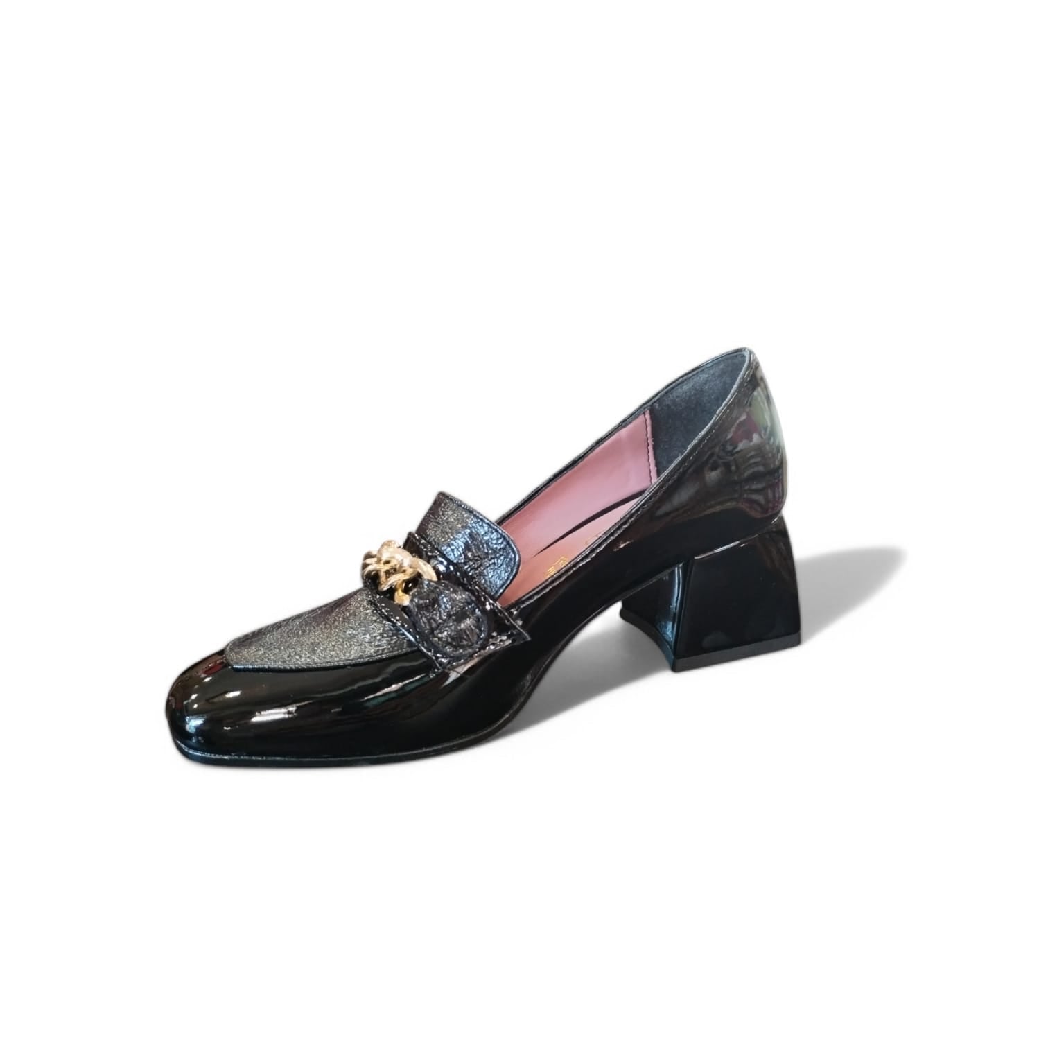 Nera in ecopelle lucida con pattina superiore grezza e una catenella color oro