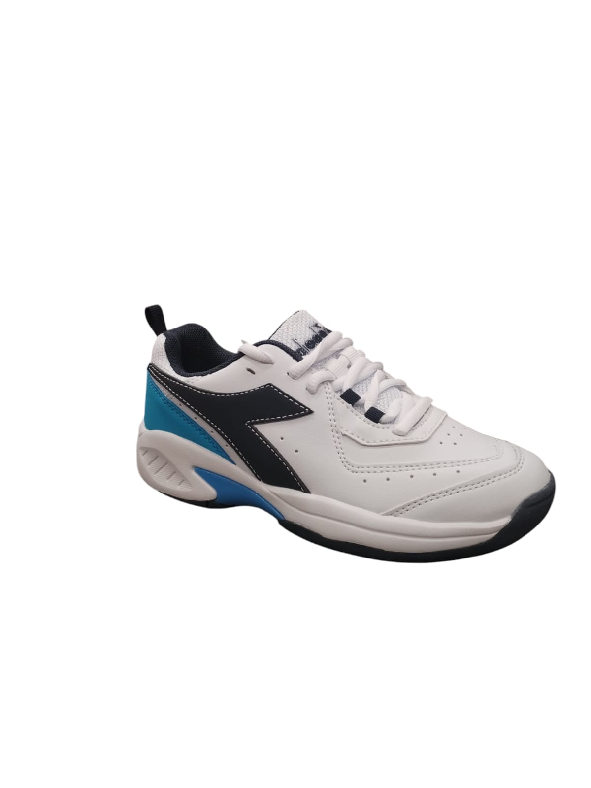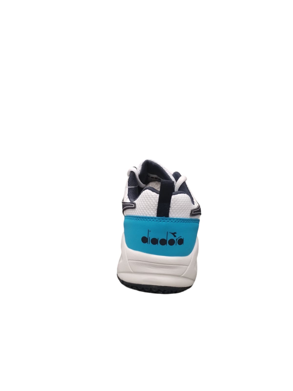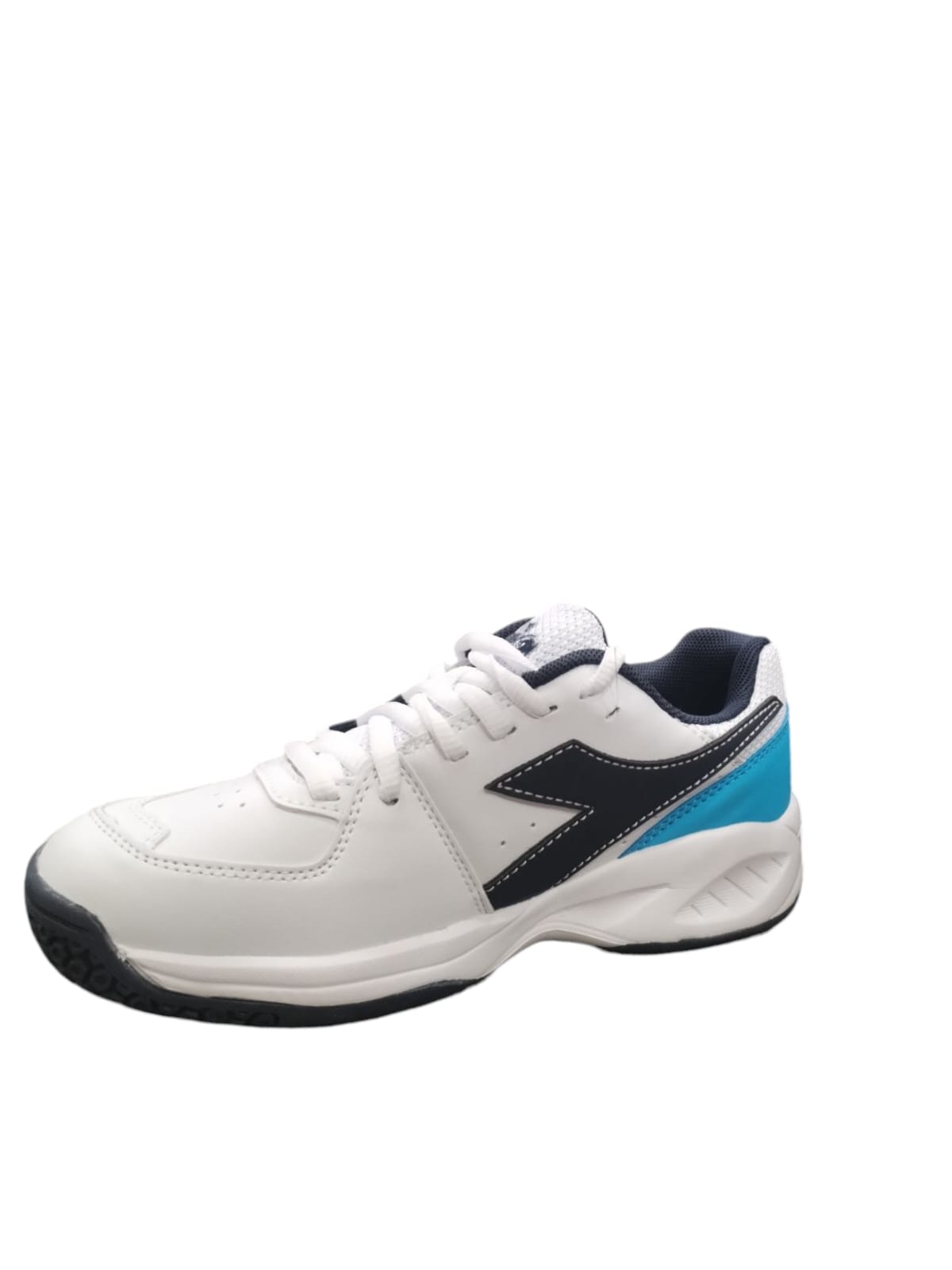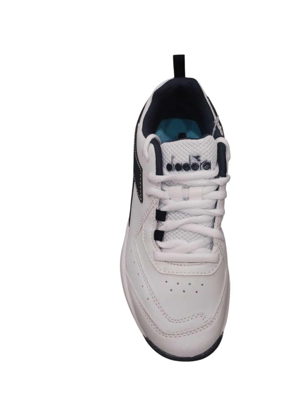 Diadora ragazzo in ecopelle bianca con logo nero e retro azzurro.